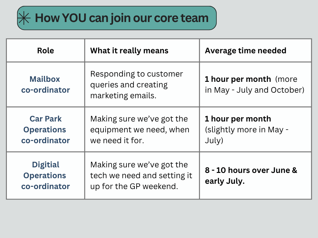 We have a variety of roles available, from helping with parking and welcoming guests to behind-the-scenes support throughout the year.